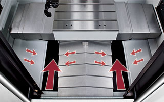 運(yùn)用貝塞爾好的支點(diǎn)的設(shè)計(jì)概念,提供了 Y 軸鞍座最穩(wěn)固的支撐,并確保全長彎曲量達(dá)到最小,大幅提升工作臺的動態(tài)精度